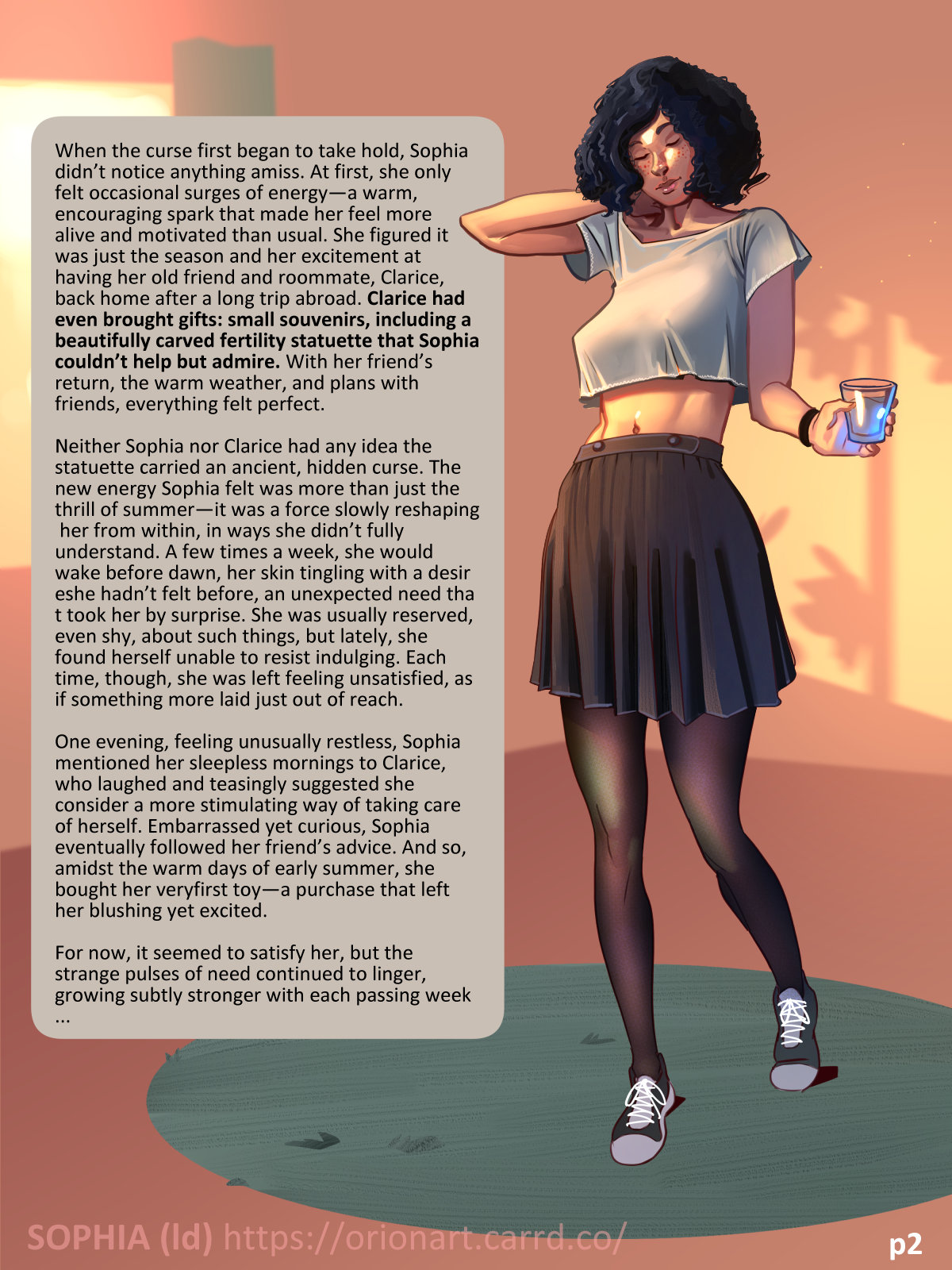 Sophia touched by cursed fertility idol gets gigantic breasts, massive ass, plump belly, unstoppable horniness. Turns friends into lovers in endless pleasure cycle. 8-page illustrated TF story!